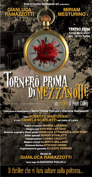 "Tornero Prima Di Mezzanotte" (Italian translation of "I'll Be Back Before Midnight") by Peter Colley, Teatro Erba, Corso Moncalieri 242, 10133 Torino (Turin) Italy. Premiered May 2011.